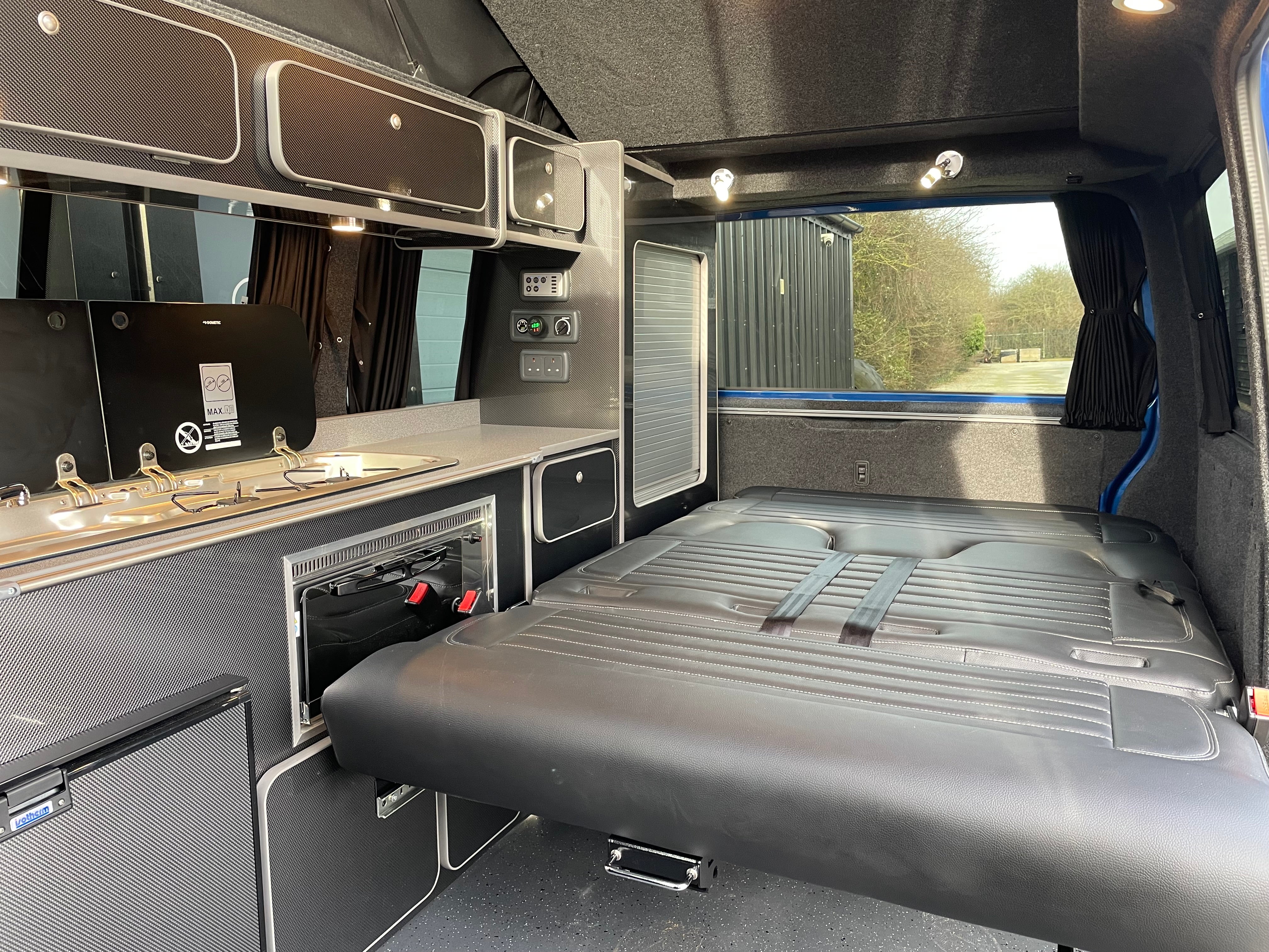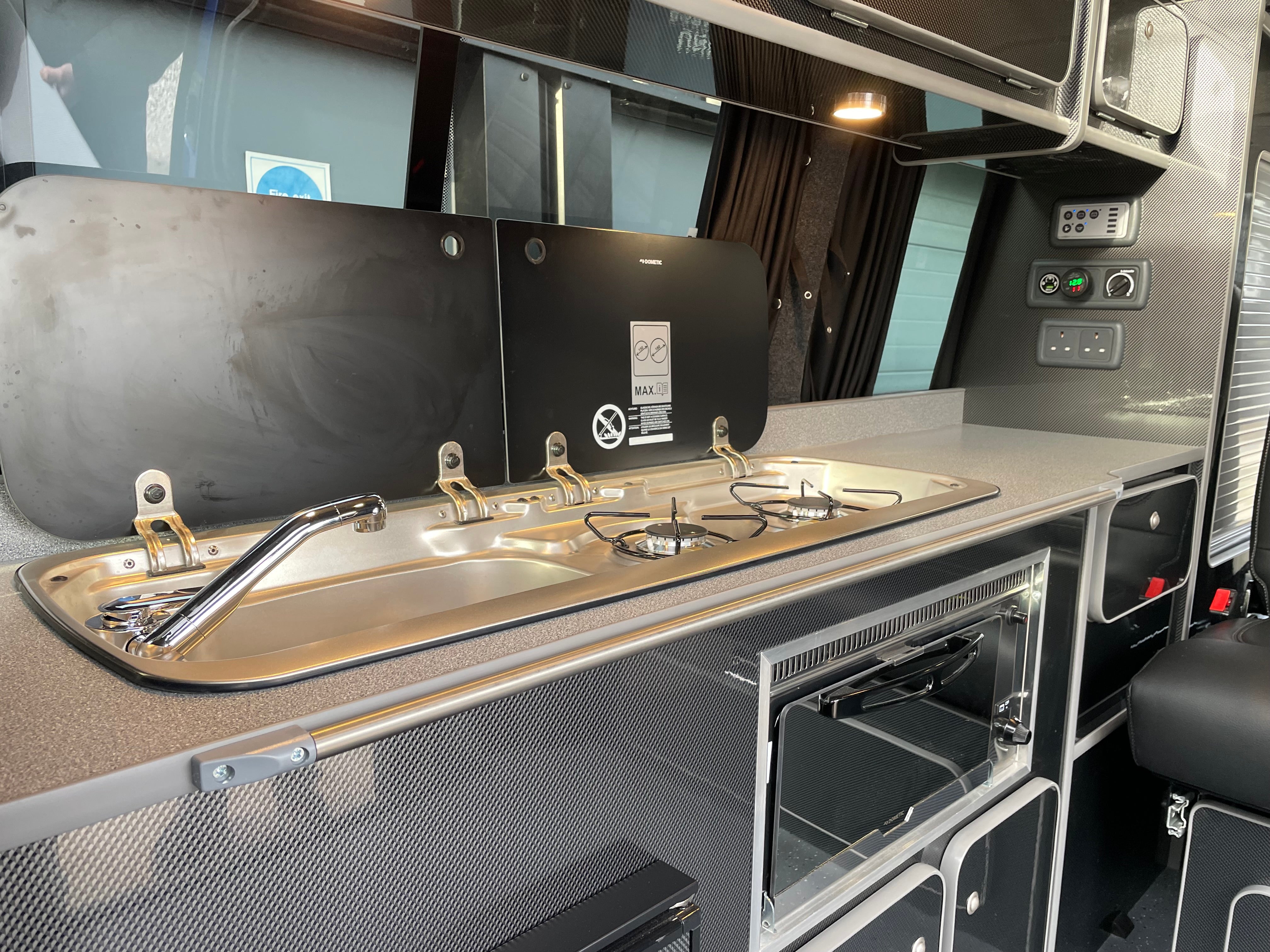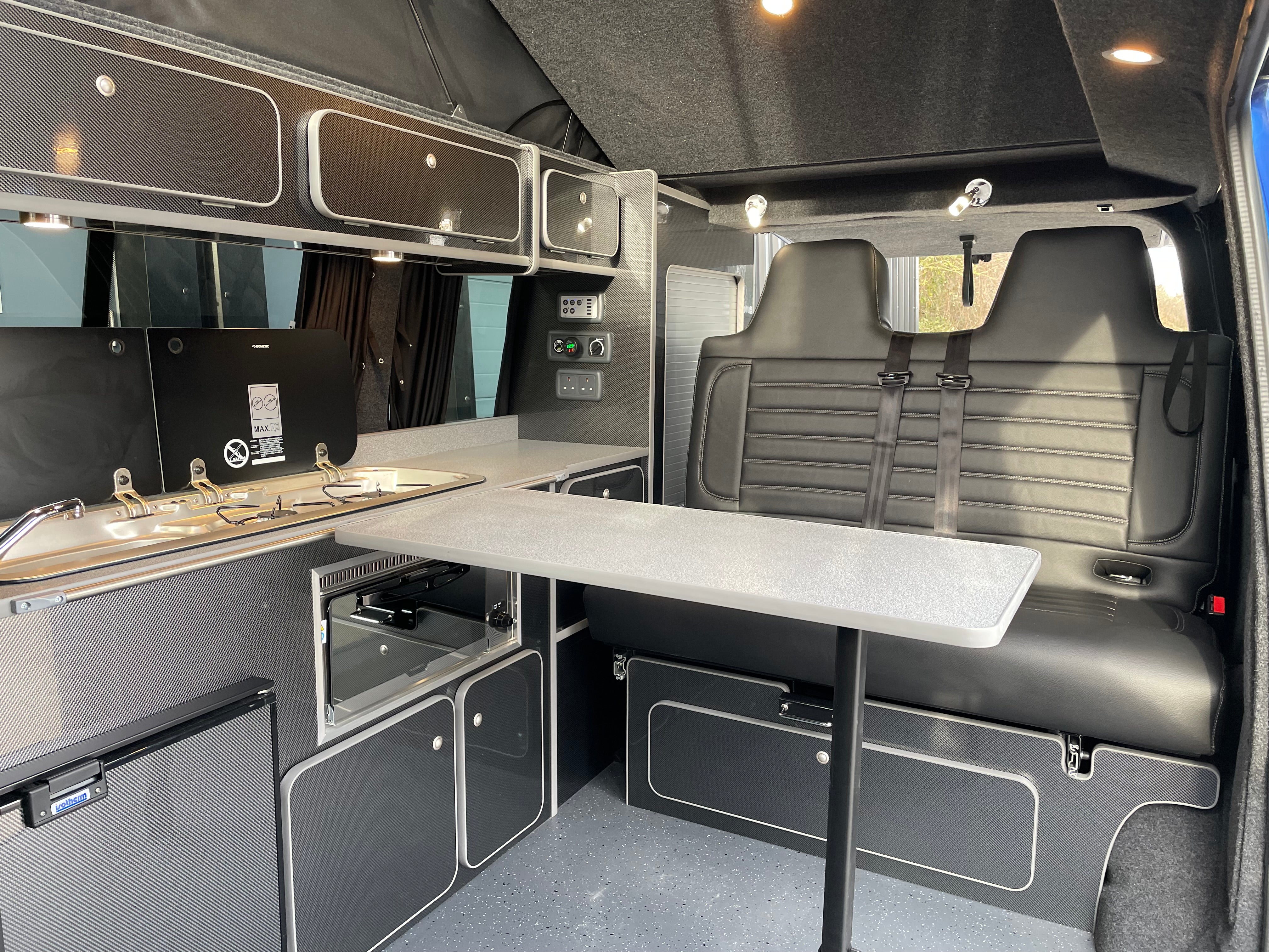 Fabworx Rock and Roll bed; compressor; 42 litre fridge with ice box; 110 amp leisure battery; split charging system; mains electric hook up; entry lights; Smev hob with smoked glass lid; Dometic sink/hob with smoked glass lid; dometic grill; under floor 45 litre fresh water tank; various cupboards and overhead cupboards; under bed storage; wardrobe; LED lighting; fully lined and carpeted; sleeps 4 people; cruise control; excellent bodywork and interior condition; ABS; leather steering wheel; air conditioning; airbag; anti theft system; auxiliary audio input jack for iPod etc; digital screen; bluetooth; bulkhead; CD player; captains seat; central locking; day time driving lights; heated windscreen; front fog lights; electric folding mirrors; a dedicated cupboard to fit a Porta Potti.